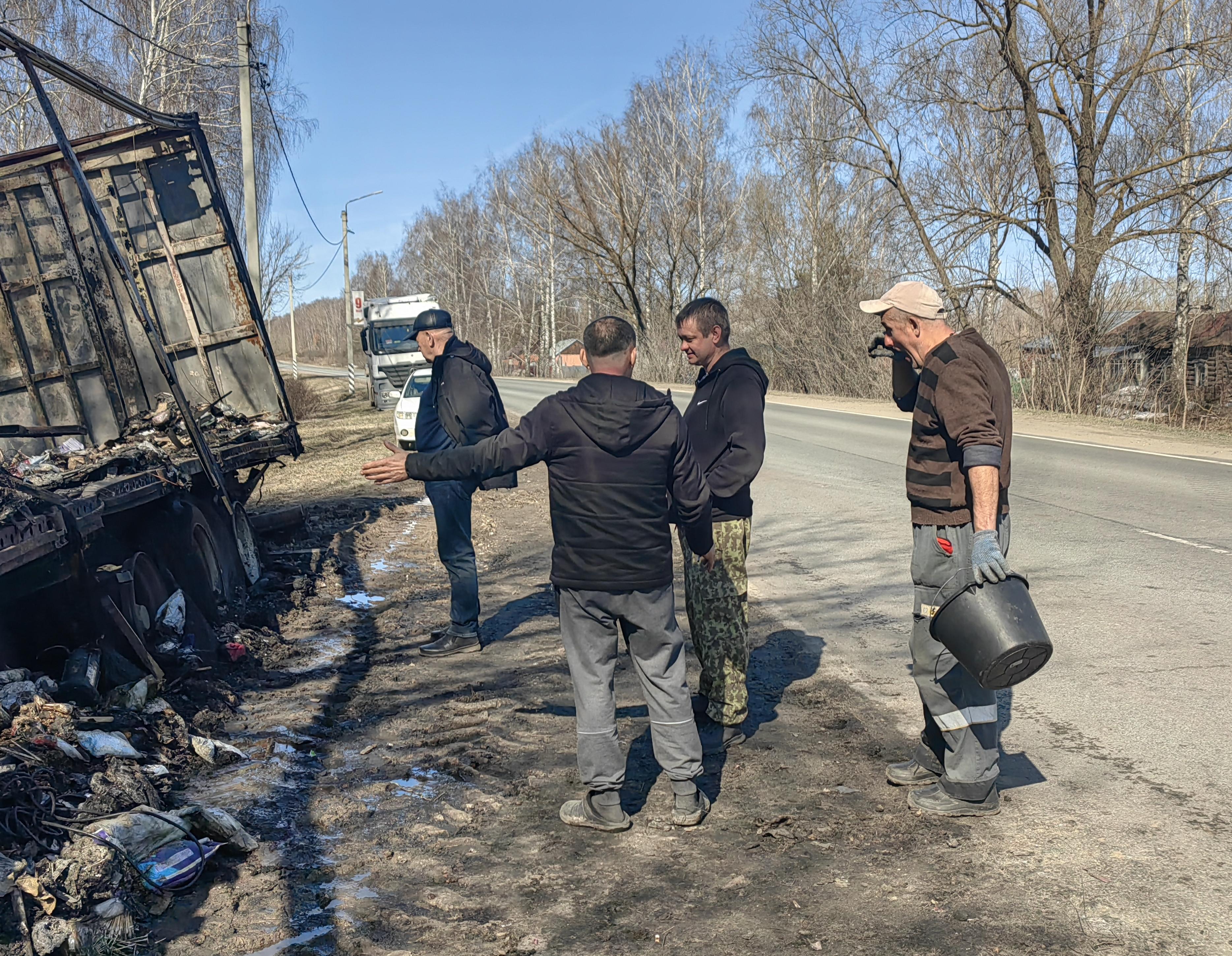 Обгоревший остов прицепа лежит на обочине в черте посёлка, привлекая внимание местных жителей. Один из зевак заявил: «Вот что бывает, когда провозят несовместимые между собой грузы».