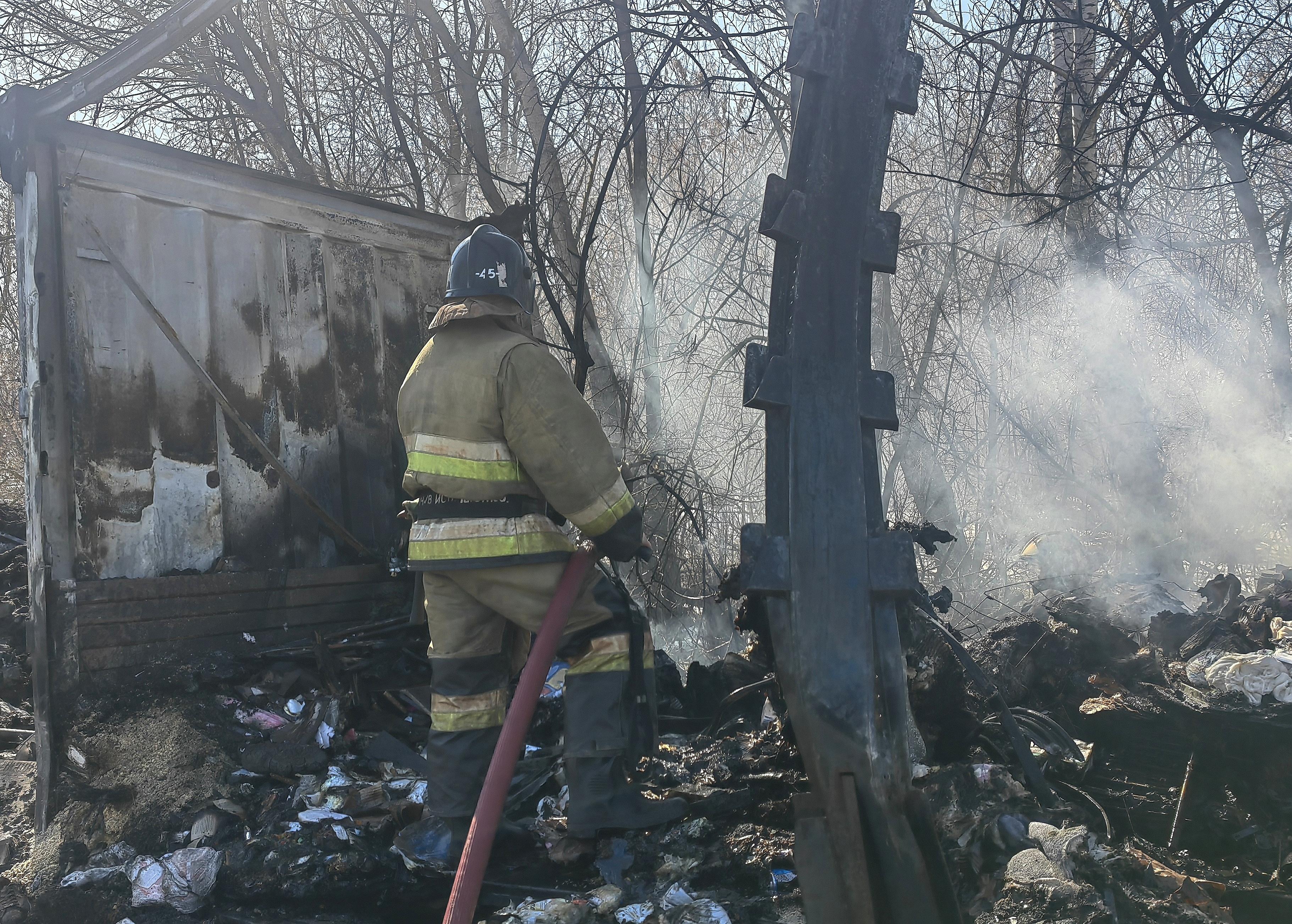 В выгоревшем кузове можно различить следы бумаги, резиновых сапог и чего-то яркого, напоминающего конфеты. От залитого водой пепелища, которое пожарные ворошат инструментами, исходит неприятный запах.