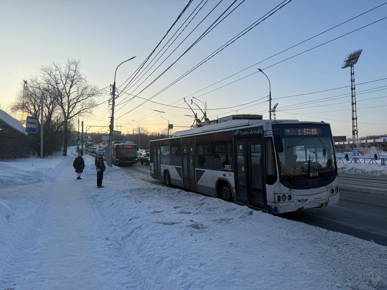 Троллейбусы простаивают на остановке без пассажиров из-за аварии на контактной сети.